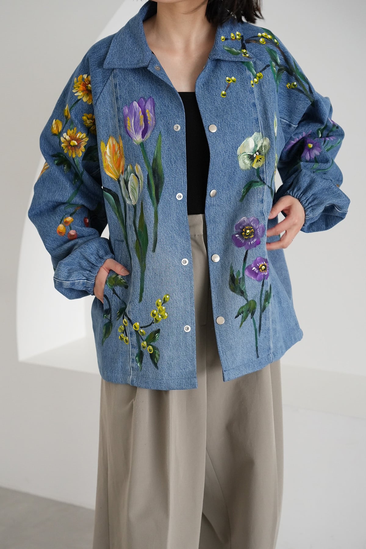 摩擦や汗などによって他の服やバッグなどに色移りすることが あります。着用の際にはご注意ください。ペイント素材部分は摩擦によって色移りしたり色落ちすることがあります。また手描きのため絵の具のハネやスレがございますが、1点ものの味としてお楽しみください。